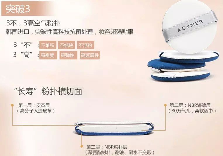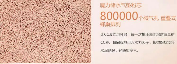 突破1 (粉芯)魔力储水气垫粉芯 800000个微气孔 重叠式蜂巢排列 让CC液均匀分散,每一次挤压都能粘附适量的CC液。瞬间释放百万水力因子,长效保持妆容水润贴服,轻薄如空气。 突破2 (贴服性)创新气喷倒灌式填充,保证粉液细腻均匀注入微气孔服帖性比一般气垫CC霜高出30~40%倒灌式成本虽然昂贵,但是底妆贴服效果异常出色,瞬间充满气孔,保证细腻均匀度。突破3 (粉扑) 3不,3高空气粉扑 韩国进口,突破性高科技抗菌处理,妆容超强贴服3“不”:不堆积 不结块 不浮粉 3“高”:高密度 高弹性 高延展性 “长寿”粉扑(横切面)第一层:皮革层(高分子人造皮革)第二层:NBR海绵层(80万气孔,柔软适中)第三层:NBR粉扑层(聚氨酯材料,耐油、耐水不变形)拥有一个好的粉扑,有多重要?市面上一般粉扑使用一段时间后粉扑会泡起来,以致盖子无法正常关合。有些粉扑密度稀松,扯一扯,就会破,粉扑寿命令人担忧。有些粉扑表层用料差,使用几次之后,液体已经透到表层来,对液体的吸附力、阻隔力不足。 突破4 (成分)植物液体黄金配比,展露透明肌同时,强效抗氧化·修护·延缓衰老角鲨烷:促进皮肤基底细胞的增殖,帮助修复破损细胞,延缓衰老。刺阿干树仁油:富含维生素E,具有强大抗氧化作用,可防止肌肤衰老。海藻糖:在细胞表面能形成独特的保护膜,有效保持细胞活性。透明质酸:自然界中发现的最好的保湿成分。突破5 (容器:隔离保鲜) 双重容器 保持新鲜隔离外部炎热潮湿,有效保持容器内有效保持精华活性,以及成分效果。以下是姐妹们的各种疑问???1、 这个产品有替换装吗?没有的哦~用完再买一个就好了~2、 遮瑕效果不够理想怎么办? 需要遮瑕效果提升的话,可以多上几次妆,因为产品很轻薄,所以几层上去都不会有厚重感觉。3、 只有一个颜色,是不是适合所有肤色的皮肤?是的,这个颜色是选了很久才选出来的,测试了不同肤色的皮肤,大家都觉得很自然,放心买吧!(如果你的肤色偏黄,提亮的感觉会稍微明显一些,白的皮肤会相对没有那么明显(这时候你也可以多涂几层,比较轻薄,怎么化都可以),皮肤的整体肤感瞬间提升就肯定的啦~~)4、 是不是任何肤质都可以用?是的,这个产品任何肤质都可以用(如果你的皮肤正在过敏期,那建议过了这段时间再用)5、 油性、混合性肌肤用这个产品会不会感觉有点黏腻?放心的哦~这个产品在测试的时候,专门找了一些混合性、油性肤质的,发现没有出油,而且很舒服,本来这类型肌肤毛孔、黑头、粗糙程度都会比较明显,皮肤也相对暗沉,但是用了之后,肤色立马提升了,非常自然,毛孔、黑头那些的,都瞬间隐形了,就是这么神奇~~6、 用了这个产品还要用BB霜吗?使用顺序是怎样的?这个产品是BB霜的超级升级版,可以代替这个产品,使用顺序:隔离--防晒--空气感气垫CC霜--粉饼定妆7、 我们的产品每天使用,大概多久可以用完?这个使用时间不一定,如果皮肤状况好,肌肤很水润,每天用2次,可用2个月,若肌肤比较干,或者涂抹比较厚,则用的量多,大致只能用一个月左右。(注意使用完之后密封,如果你发现粉液好像不多了,可以倒置产品放,隔天用的时候就会发现又正常了哦,因为藏在海绵里的粉液在你倒置的时候往上走了~)8、 产品这么透气,怎么保存?每次用完之后,记得盖好盖子,因为粉液是非常清透的配方,不盖好的话,会挥发水分,那么有可能你会发觉用得很快哦~9、 用这个产品要卸妆吗?要的,属于粉质的产品,要卸妆的哦~(平时就算没有化妆,现在这么脏的空气,都要卸妆呢,不然容易堵塞毛孔)10、 我们的粉扑怎样清洗?不建议洗,因为粉扑有三层,边是胶粘的,胶遇水会裂开。这个粉扑经过抗菌处理,正常使用,不用担心,也不需清洗,用完一个再买就ok了。11、 不会化妆怎么办?这个产品几乎是所有不会画底妆,比较懒,但是又希望可以每天都美美见人的同时,别人又看不出来你化了妆的MM用的,随身携带,30秒瞬间就有一个完美底妆,所以大家都追捧!!12、空气感气垫CC霜有隔离防晒效果吗?有轻微的隔离防晒效果,这个主要是修饰皮肤的产品,想要达到隔离防晒效果,需要独立购买使用隔离防晒产品。  |