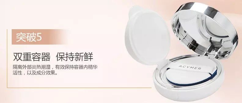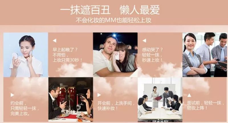 早上起晚了?不用怕,上妆只需30秒!约会前,只需轻轻一抹,完美上妆。感动哭了?轻轻一抹,秒速上妆!开会前,上洗手间,快速补妆! 面试前,轻轻一抹,轻妆上阵!从此摆脱掉各种补妆工具,一瓶【气垫CC霜】就能搞掂了。随着 【气垫CC霜】出现,BB霜将会退出这个历史的舞台,完全由【气垫CC霜】代替,所以,你还在用BB霜,OUT啦。妍诗美的【气垫CC霜】又有什么过人之处,优势呢?  五大突破: