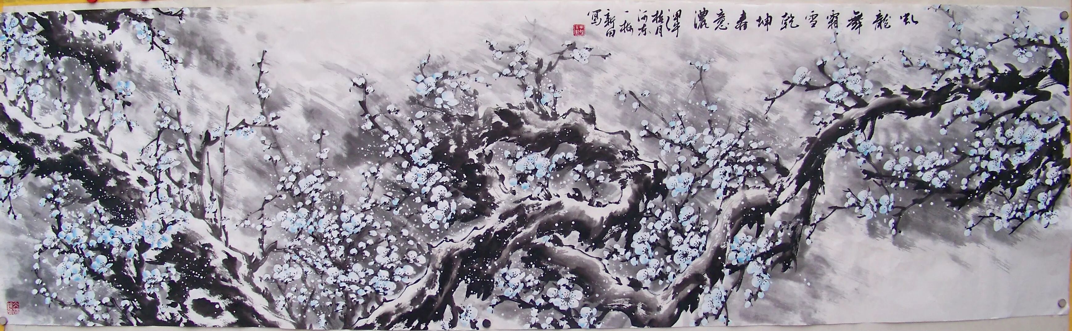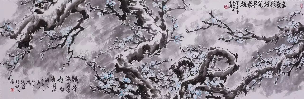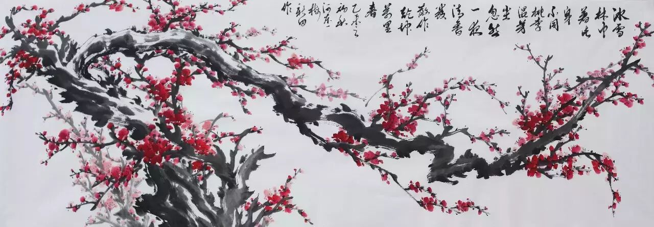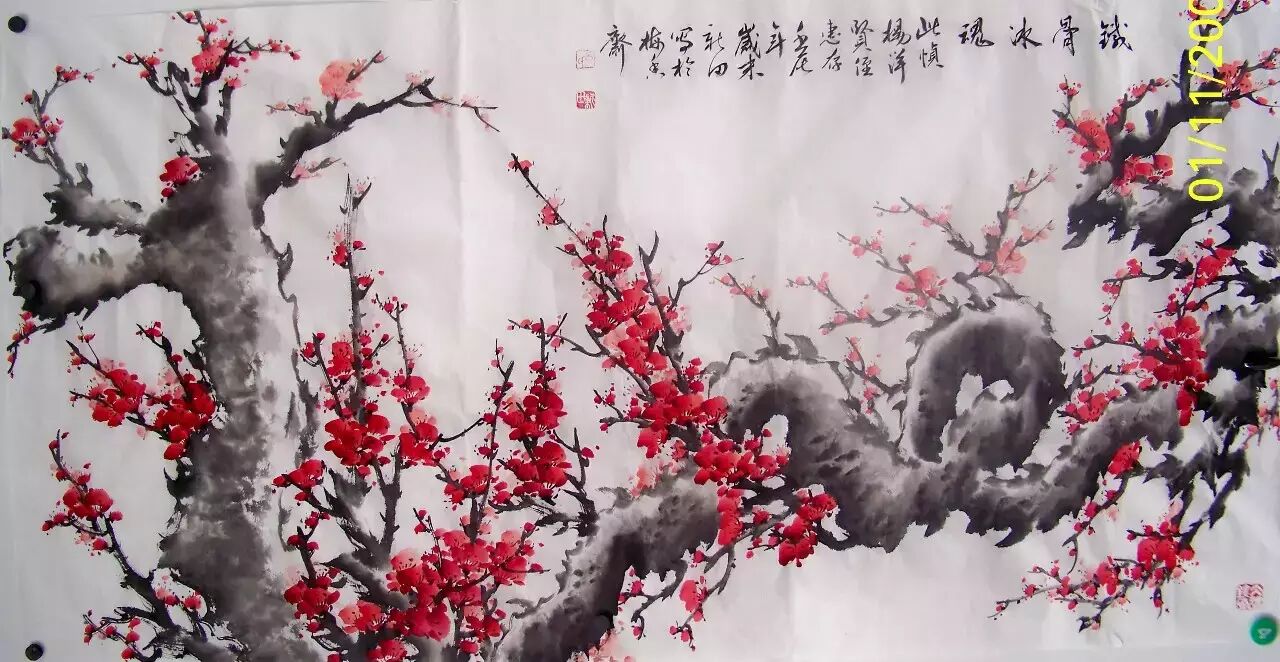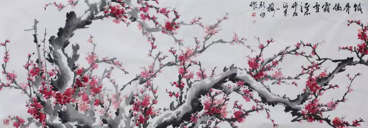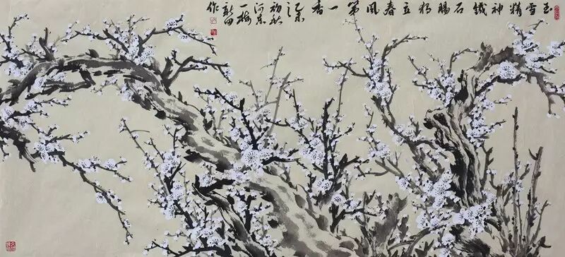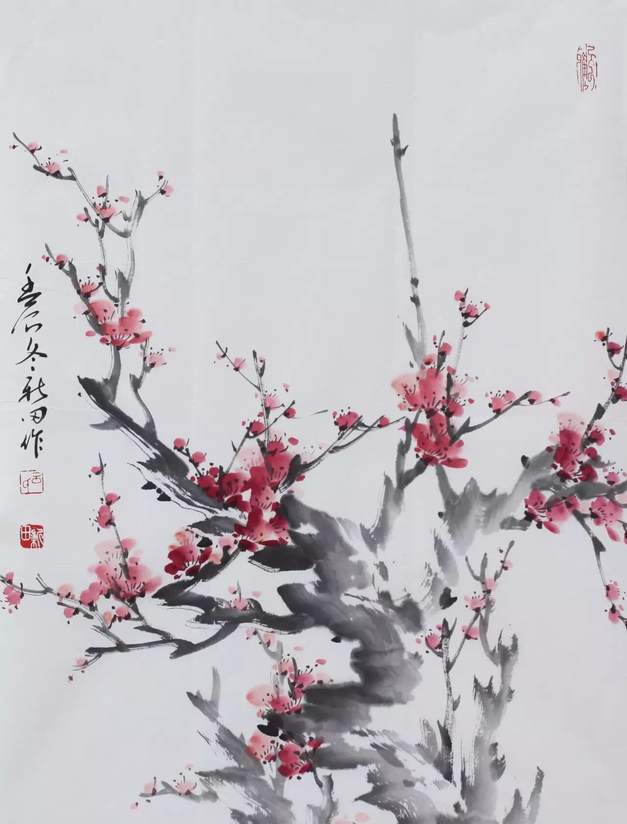 梅花蕴含着中华民族的审美趋向、情感脉络和道德标准。梅花是民族之魂,民国时期被尊为“国花”,梅花自身的形态之美吸引了人们喜爱,画家吕新田笔下的梅花又是另一种独特韵味,梅花色彩众多,而人们偏爱白、红、黄三色。尤其白色,冰清玉洁与冰雪相和谐。