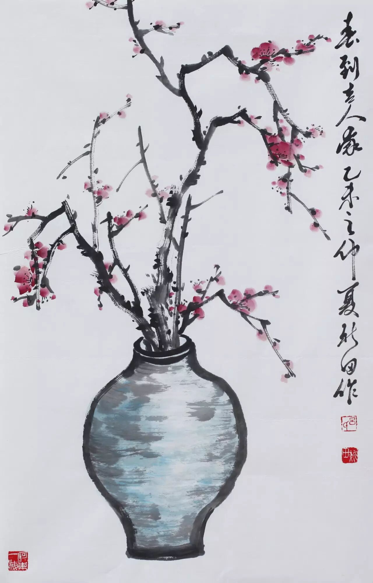 复员后,在朋友的帮助下,他落户于运城。开启了他人生新篇章。娶妻生子后他带着工人做些工程,后来停止工程生意,转向自己多年前就喜欢的书画创作之路。“不经一番寒彻骨,哪得梅花扑鼻香”, 从大山深处走来,历经人生风雨洗礼,让他渐渐地迷上了画“梅”。在创作过动中,他结识了不少名家,总是虚心请教,先后与丁绍光老师、赵望进老师、张呈祥老师、杨善亭老师等都有过书画交集。平日里研读名家书画著作,《芥子园画谱》便是他常思考揣摩的传统经典之一。随着日久功进,吕新田水彩梅花逐渐形成了独到的韵味、雅致、亲和、活泼,就这样一种雅俗共赏的美感让不少人记住了他的名字。