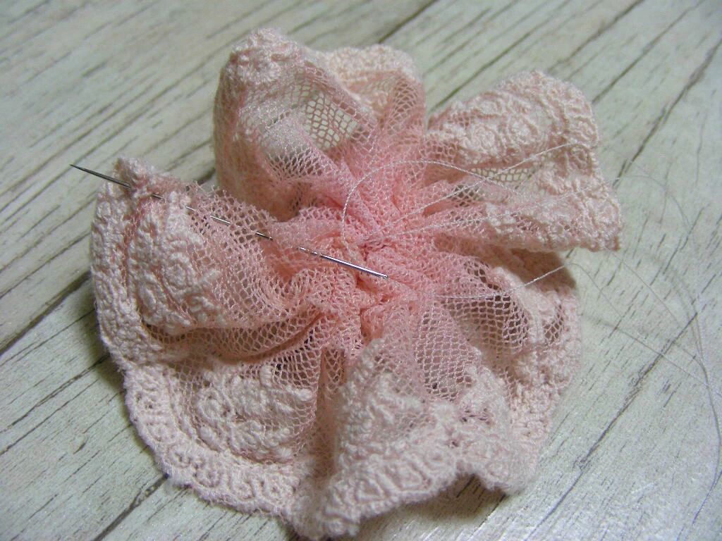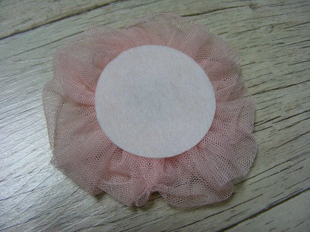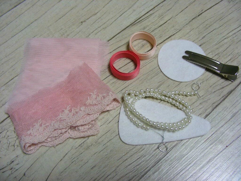 蕾丝花边就是从头缝到尾 用力一拉就缝成圆 再把纱和蕾丝花两个用胶组合 用上不织布 方便 上夹子