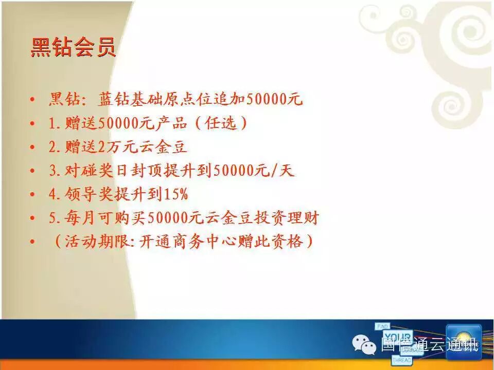 那现在5万元升黑钻对一部份人来说不算什么,可是还有很多普通老百姓感觉还是很吃力的,公司也是比较有人性化的,再加上很多也是从电话市场过来的老会员,那么,公司为了减轻大家的压力,现在给开通一个优惠政策: 在推广期间蓝钻会员可以用1万元升级,即可成为黑钻资格,并且自动成为商务中心,享受5%的报单费,(不算黑钻业绩也没有金豆赠送)但参与店网奖励制度,同时可获得连锁加盟开店权利。