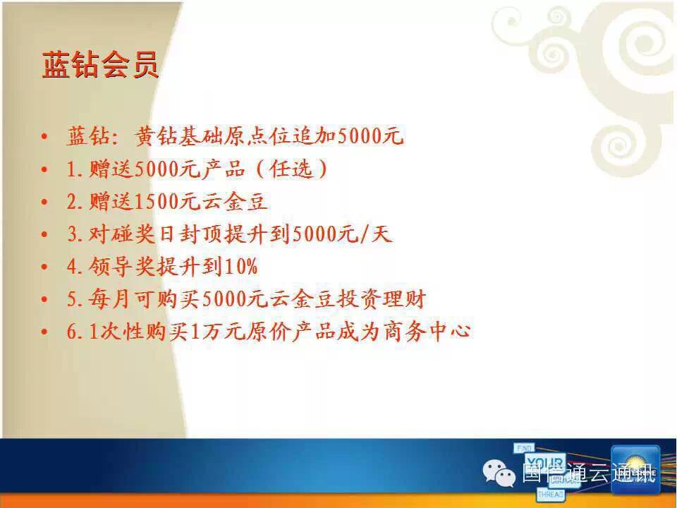 我们会员在黄钻的点上追加5000元,原点升级为蓝钻,那我们将会重复得到以下奖金