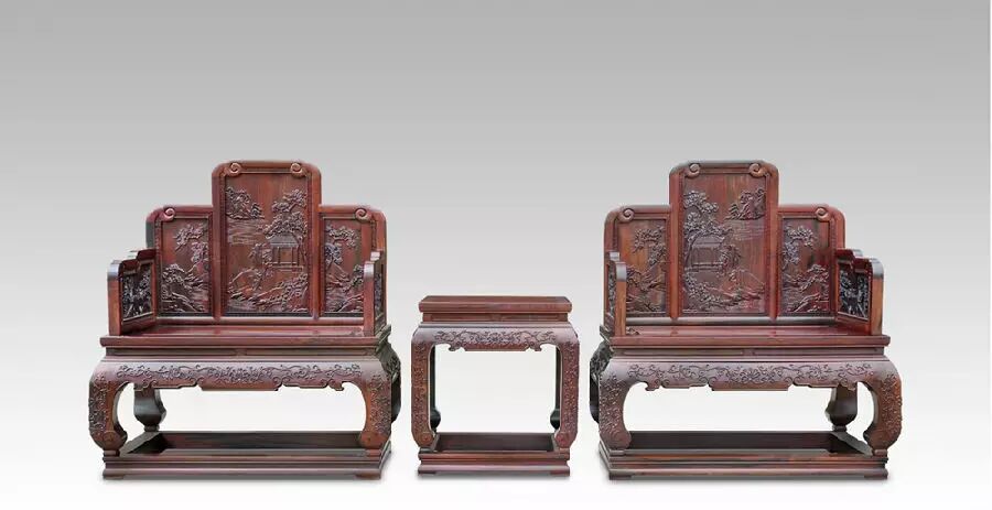 “皇宮椅”産于清朝皇宮,是皇帝專用禦制。古時的皇宮椅以雕龍畫鳳爲主,是社會等級制度的象征。隨著封建制度的消滅和社會的發展,今天的皇宮椅已經進入尋常百姓家。工藝制作上進行了大膽的創新和發展。現在的皇宮椅不單單雕龍畫鳳,還雕花鳥、人物和山水等題材。也由固定的兩張發展到六件套、十件套等十幾種規格,用材方面有黃花梨、紫檀、酸枝、楠木等材質。