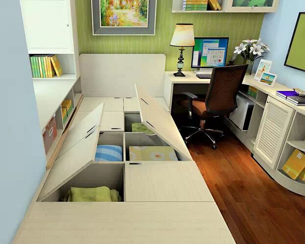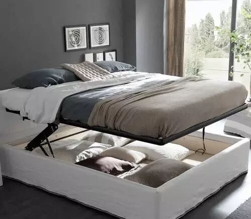 ❸ 翻板床,用来收纳过季衣物首选。有人会觉得支撑杆可能容易坏,可仔细想想,床底收被子的话,一年也就开合几次,坏的概率绝对不高。