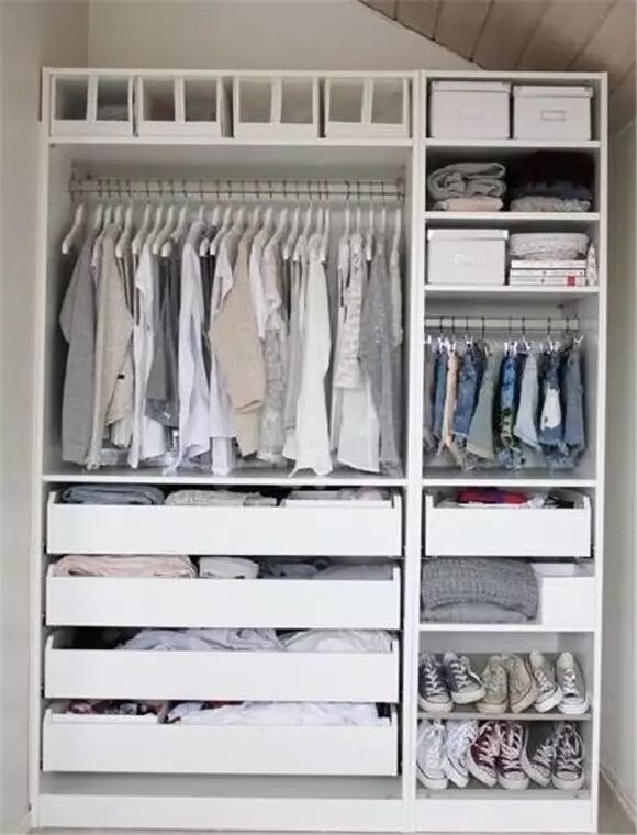 二.衣柜收纳中心思想:分门别类,善用每个收纳区域,否则多大的衣柜都没用。PS:定制衣柜可以自由组合层板和间隔高度,强烈推荐。