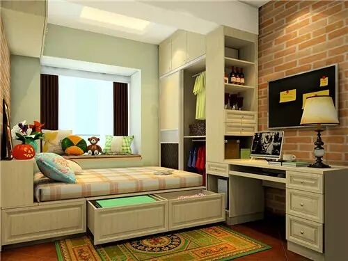 ❹ 榻榻米(床)。这里说的榻榻米床是第二种抽屉床的进阶形式,睡觉不再是核心功能,而是变成了多功能家具的存在。收纳量远高于以上3种,近几年来备受青睐。