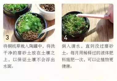 水培也可以与土培相结合。将土壤铺在陶罐底部,再装上适量的清水,这样土中丰富的营养物质就会更好地帮助植物成长了。最适合用这种方式栽培的植物莫过于铜钱草。铜钱草生命力十分旺盛,不需几天就能成倍增长。记得当罐中清水减少时,要及时补充。