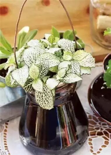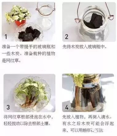 装咖啡或花茶的玻璃瓶总是非常美貌。如果我们再为它们加上铁丝做的把手,那就更是“美不胜收”了。要是再用它们来水培绿色植物,那真是“清新得一塌糊涂了”。我们可以在水中放几块木炭,以省去经常换水的麻烦,达到净化水质的效果。记得瓶中水量减少时要及时进行补充哦!