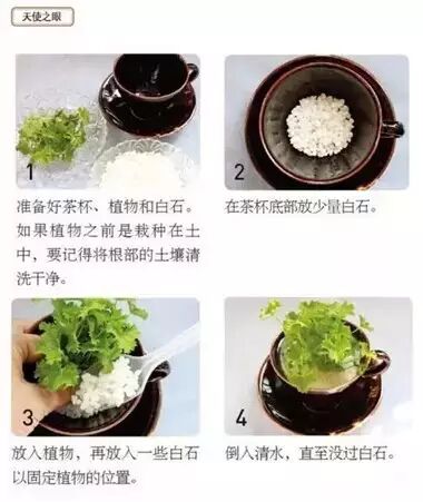 想必你家中也有那么几个弃之可惜、用之无趣的茶杯吧?现在就是它们派上用场的时候啦。像茶杯这样开口较大的容器非常适合水培植物。为了防止植物倾倒,最好放一些白石在杯底。记得杯中水量减少时要及时补充。