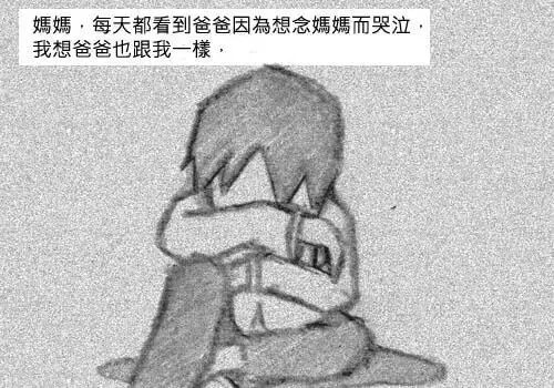 他不想让儿子看到自己流泪,所以冲到洗手间,将水龙头打开,大声地痛哭------过了好一阵子,他打开儿子的房门一看,发现儿子已和衣睡着了,脸上满是泪水,手里还拿着妈妈的照片。