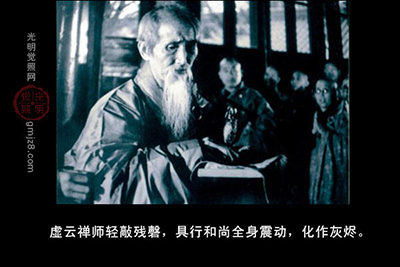 众人慌忙让开,虚云扶杖来到具行面前,向众人说:“具行已经作化了!他自身出三昧真火,把自己烧成了灰!刚才你们看见的白光闪闪,就是他的真火之光!我在禅房为他念经助他用,感到全身发烧,就知道他已经成功了!我怕你们不知道而乱动他,连忙赶来……。”