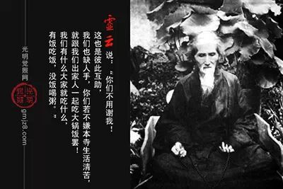虚云说:“你们不用谢我!这也是彼此互助,我们也缺人手,你们若不嫌本寺生活清苦,就跟我们出家人一起吃大锅饭罢!我们有什么大家就吃什么,有饭吃饭,没饭喝粥。”