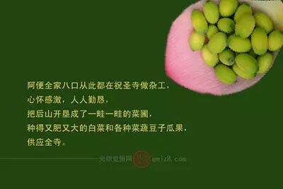 阿便全家八口从此都在祝圣寺做杂工,心怀感激,人人勤恳,把后山开垦成了一畦一畦的菜圃,种得又肥又大的白菜和各种菜蔬豆子瓜果,供应全寺,又把全寺整理打扫得一尘不染,阿便自己住在茅蓬,不与妻室同居。