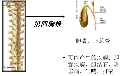 第四胸椎段:主要关联肺、支气管、胆囊、胸肋等。如发生障碍,易患肺炎、气喘、黄疸、胸膜炎、乳房痛、肋间痛等症。
