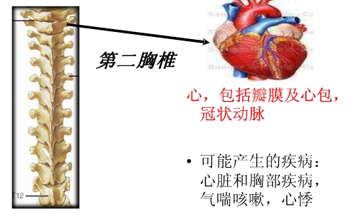 第二胸椎段:主要关联心脏、气管、食道、肩臂等。如发生障碍,易患食道炎、胸痛、气喘、咳嗽、血压异常、心律失常、肩臂酸麻痛、手麻木等症。