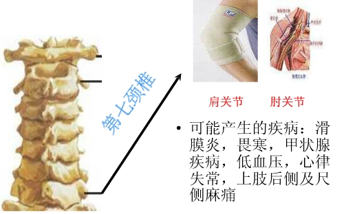 第七颈椎段:主要关联甲状腺、食管、气管、心肺、肱肌等。如发生障碍,易患甲状腺炎、低血压、心律失常、手臂外侧、中指、肱肌、无名指酸麻痛等症。