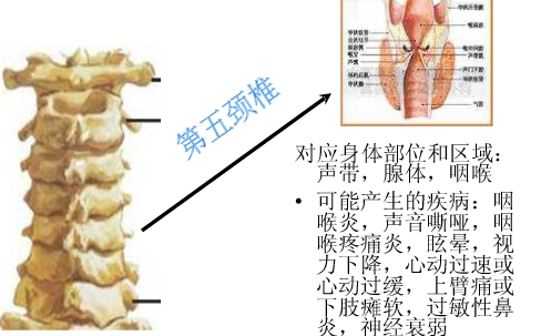 第五颈椎段:主要关联手肘、食道、气管、横膈膜、心脏等。如发生障碍,易患气管炎、咽喉炎、哮喘、手臂酸痛、心动过速或过缓等症。