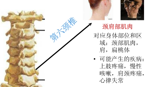 第六颈椎段:主要关联甲状腺、食道、气管、心肺、上肢等。如发生障碍,易患上臂或手腕痛、甲状腺炎、低血压、心律失常、五十肩、大拇指酸麻痛等症。