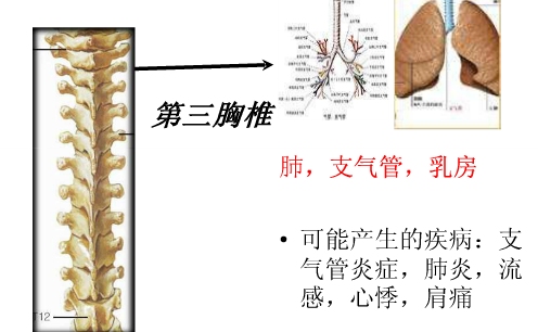 第三胸椎段:主要关联肺、支气管、食道、心脏、胸腔等。如发生障碍,易患气喘、咳嗽、支气管炎、肺炎、食道炎、肋膜炎、心脏病、胸闷、胸痛等症。