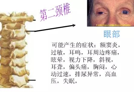 第二颈椎段:主要关联耳、鼻、喉、舌、声带、口等。如发生障碍,易患昏眩、偏头痛、耳鸣、胸闷、扁桃腺炎、腮腺炎、鼻窦炎、过敏、失声等症。