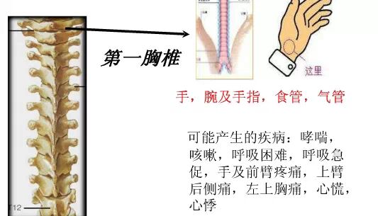 第一胸椎段:主要关联心脏、气管、食道、前臂等。如发生障碍,易患心慌、心悸、气管炎、气喘、咳嗽、呼吸困难、左上胸痛、手腕痛、手臂后侧痛等症。