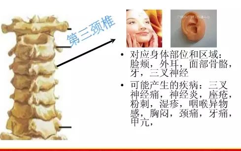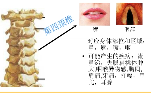 第三颈椎段:主要关联咽、颊、肩、横膈等。如发生障碍,易患咽喉炎、咽喉部异物感、牙痛、颈肩酸痛、呼吸困难、甲状腺功能亢进等症。