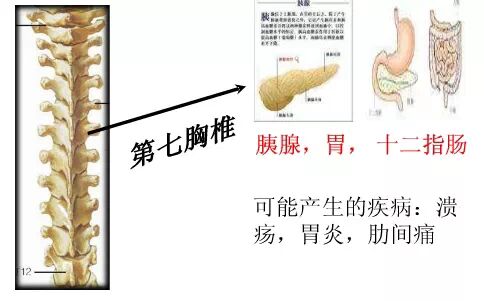 第七胸椎段:主要关联肝、胆、胰、十二指肠等。如发生障碍,易患肝区痛、胆石症、胃溃疡、2型糖尿病、十二指肠炎、扁桃腺炎等症