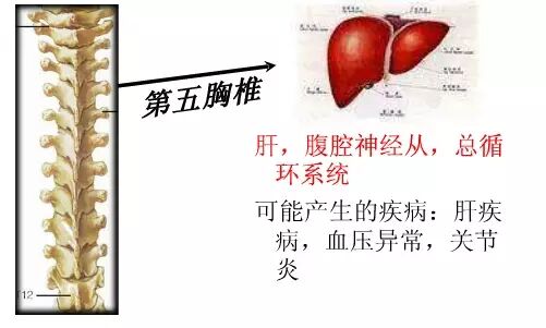 第五胸椎段:主要关联肝、胆、脾胃、胸壁等。如发生障碍,易患肝炎、胆囊炎、脾肿大、低血压、胃炎、乳房痛、胸壁痛等症。