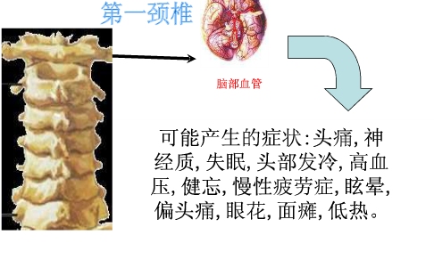 第一颈椎段:主要关联头、耳、鼻、喉、脸等。如发生障碍,易患头痛、失眠、视力下降、记忆减退、眩晕、高血压和面瘫等症。