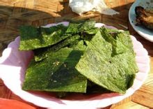 青苔还可加工成傣语称为“改些”和“改养”的干品。“改些”又称“改义”。其加工方法是将新鲜青苔洗净,捡尽杂质,拉开苔丝,摊成薄片晒干即成。“改养”又称“改英”,加工方法与“改些”大同小异。加工这种青苔干品,只需在摊开的青苔上撒些姜末和盐水晒干即成。青苔干品,统称青苔片,主要作为商品上市。青苔片可用清水发开成新鲜青苔,烹饪青苔汤、清蒸青苔和卵石青苔汤。同时还可用干品烹制油煎青苔和烘烤青苔。烹饪油煎青苔,只需将青苔片剪成一寸见方的小块,在沸油中过一次油即可食用。烘烤青苔需用文火慢烤,边烧烤边的青苔片上抹油,直至烘熟烤脆即装盘供食。油煎青苔和烘烤青苔,形呈片状,色翠绿,香脆而具有海味气息。傣家人多用糯米饭蘸裹食用。