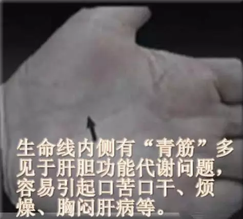 (5)生命线附近有青筋,多见于肝胆功能代谢有问题,容易口苦口干,烦躁,胸闷,肝病等。