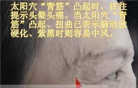 1、太阳穴青筋凸起,表示有脑动脉硬化、头痛、中风的迹象