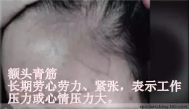 2.额头有青筋,提示长期劳心劳力,紧张,工作压力或心情压力大。