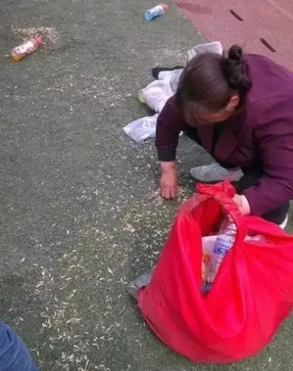 4绿茵场上,清洁阿姨正在用手指甲拾起一瓣瓣瓜子壳。