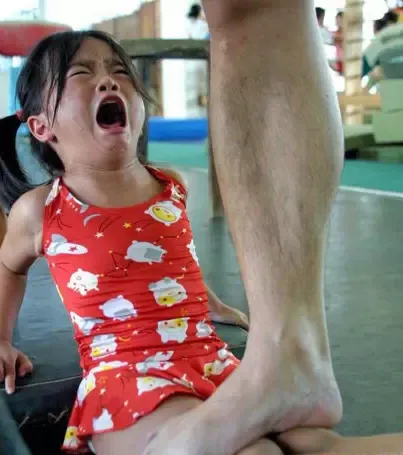 一名年仅4岁的小女孩被父母送到南宁市体育馆业余体校学习体操,教练为帮助她练好柔功,用脚给她辅助训练,小女孩非常害怕,大哭了起来。