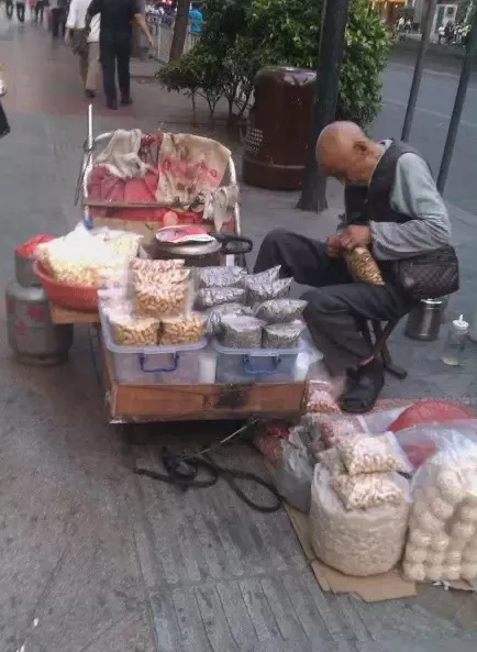 有一位80岁左右的老人在摆摊, 用颤抖的双手为客人包装煮好的花生和瓜子,我不爱吃瓜子,当我拿起两包瓜子的时候,老人用含糊不清的话笑着给我换了一包,说,这包比较满,要这包吧。