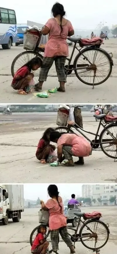 一个浑身上下黑乎乎、脏兮兮的小女孩在马路上发现2包被车碾过的方便面,就和妈妈下车找空塑料袋,把散落在地上的方便面残渣小心翼翼地捡了起来。