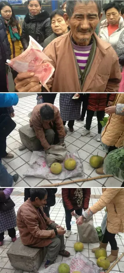 葛大爷沿街叫卖柚子,两名妇女和一名男子用300元分3次买了6个柚子。大爷找零后才发现这300元都是假钱!揣着三张百元假钞,葛大爷欲哭无泪,路过市民知情后,纷纷掏出10元、20元送给大爷作车费…
