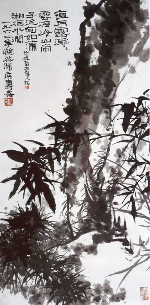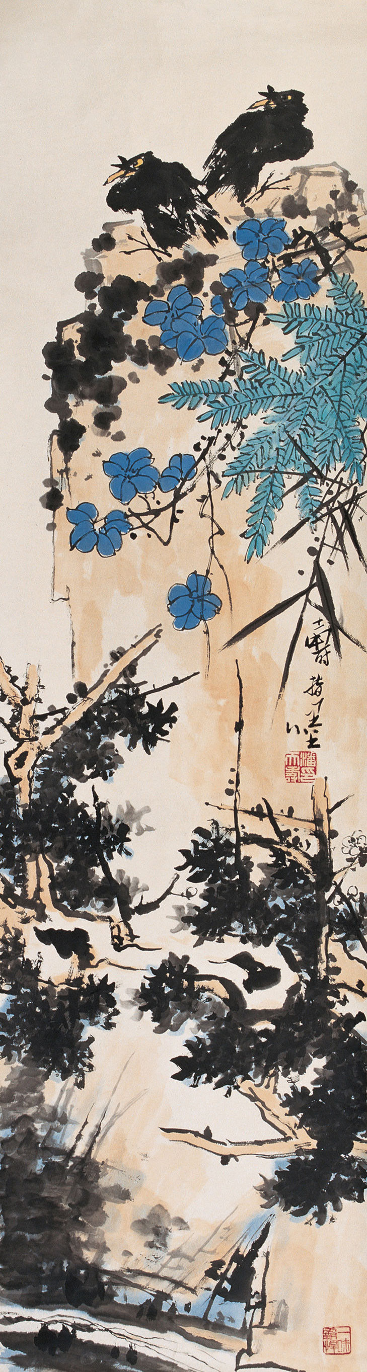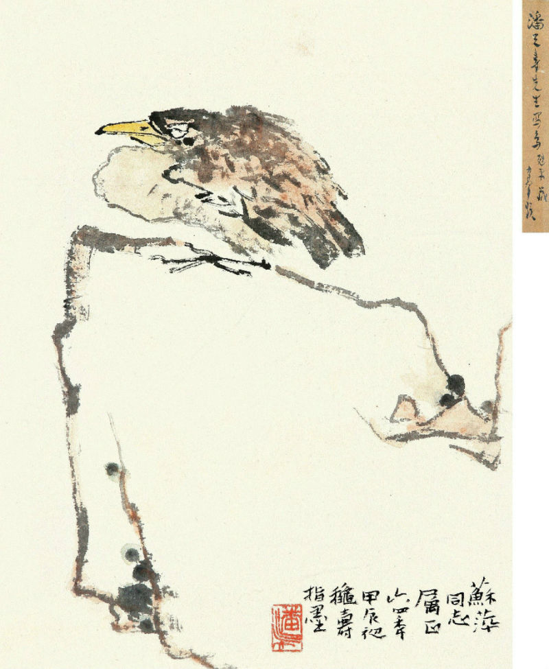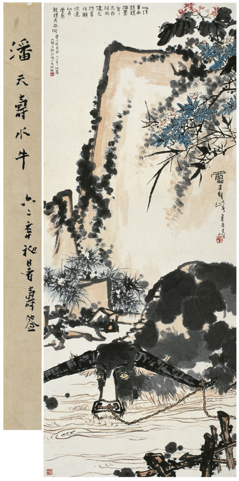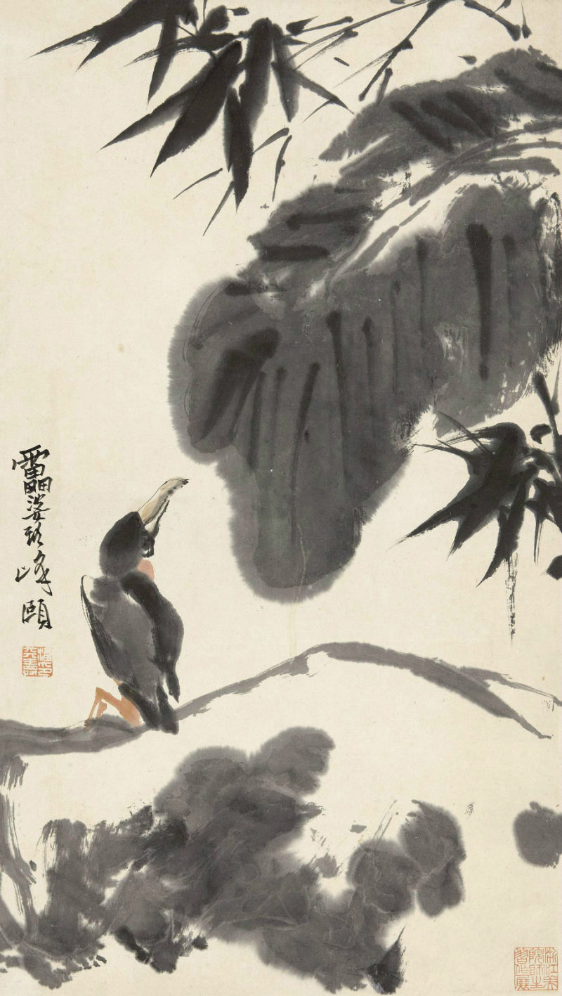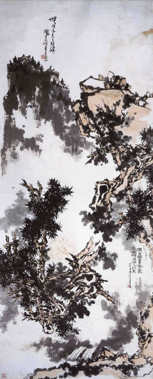 潘天寿擅画写意花鸟和山水,远师徐渭、朱耷、原济(石涛)等人,近受吴昌硕影响;其画破常规、创新格,布局敢于造险、破险,笔墨浓重豪放,有金石味,色彩单纯,气势雄阔。书法从钟繇、颜真卿、史孝山人入手,后学秦汉、魏晋碑文,参以卜文猎碣。此幅小龙湫下一角图轴与潘天寿纪念馆藏品极为相似。