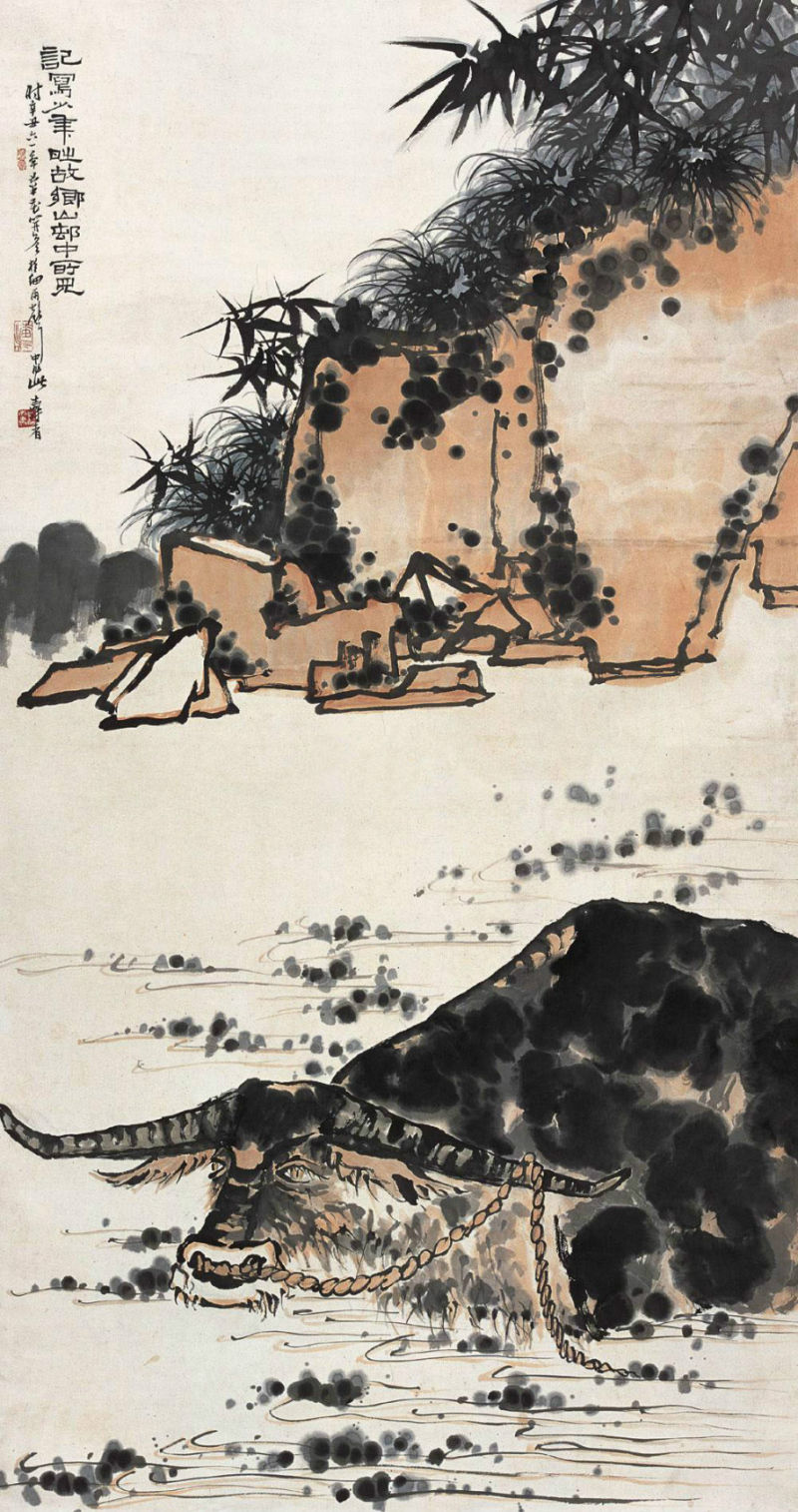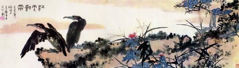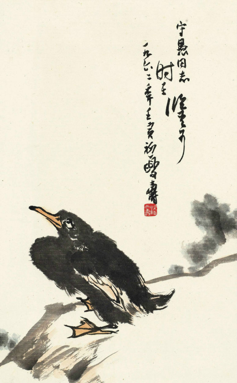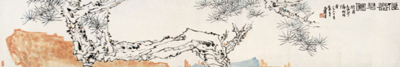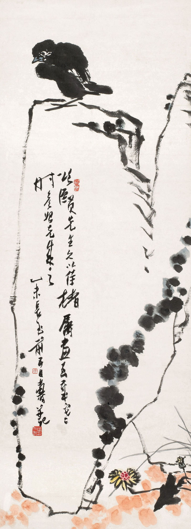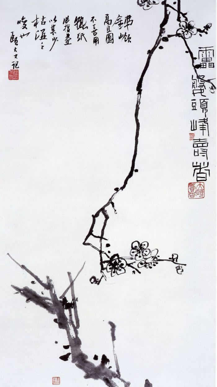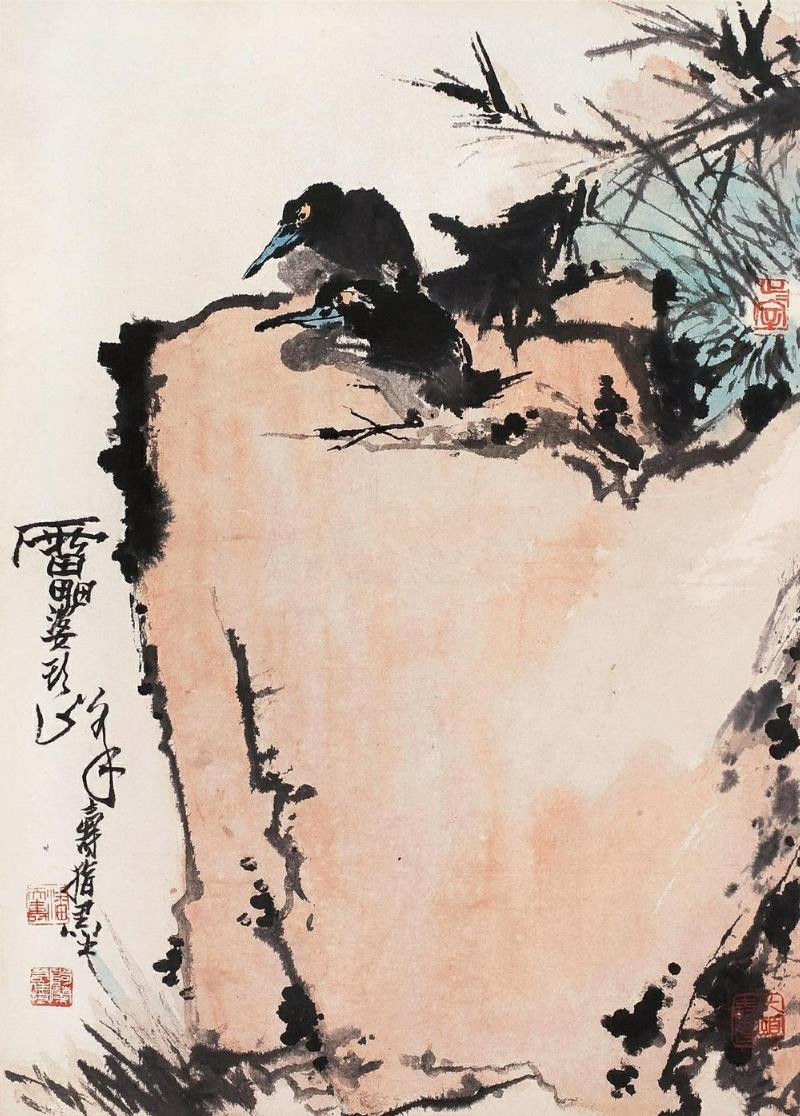 潘天寿擅画写意花鸟和山水,远师徐渭、朱耷、原济(石涛)等人,近受吴昌硕影响;其画破常规、创新格,布局敢于造险、破险,笔墨浓重豪放,有金石味,色彩单纯,气势雄阔。书法从钟繇、颜真卿、史孝山人入手,后学秦汉、魏晋碑文,参以卜文猎碣。此幅小龙湫下一角图轴与潘天寿纪念馆藏品极为相似。
