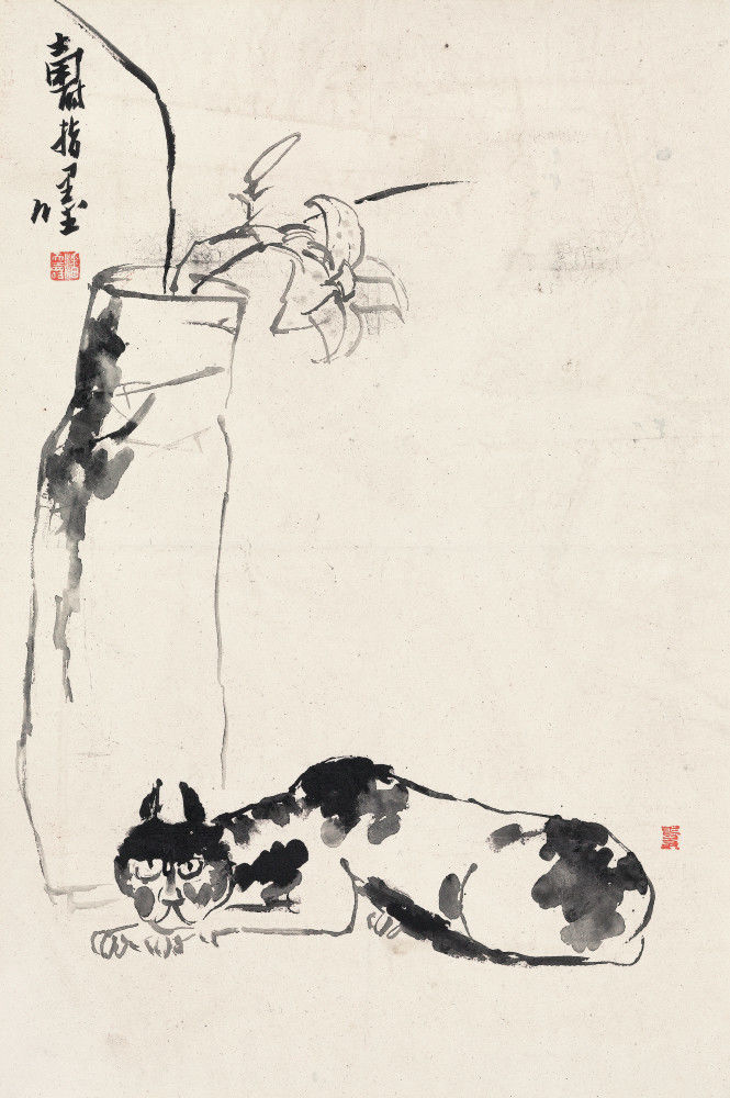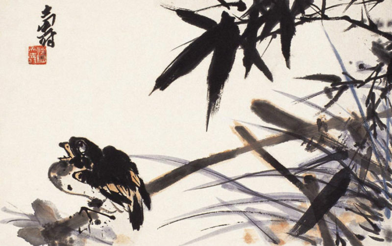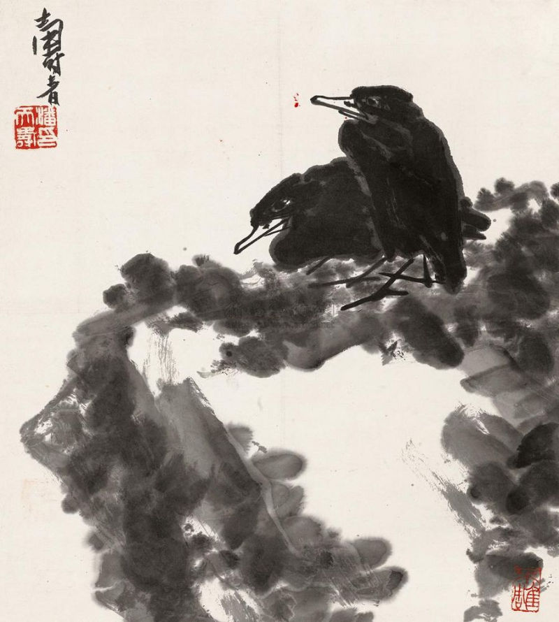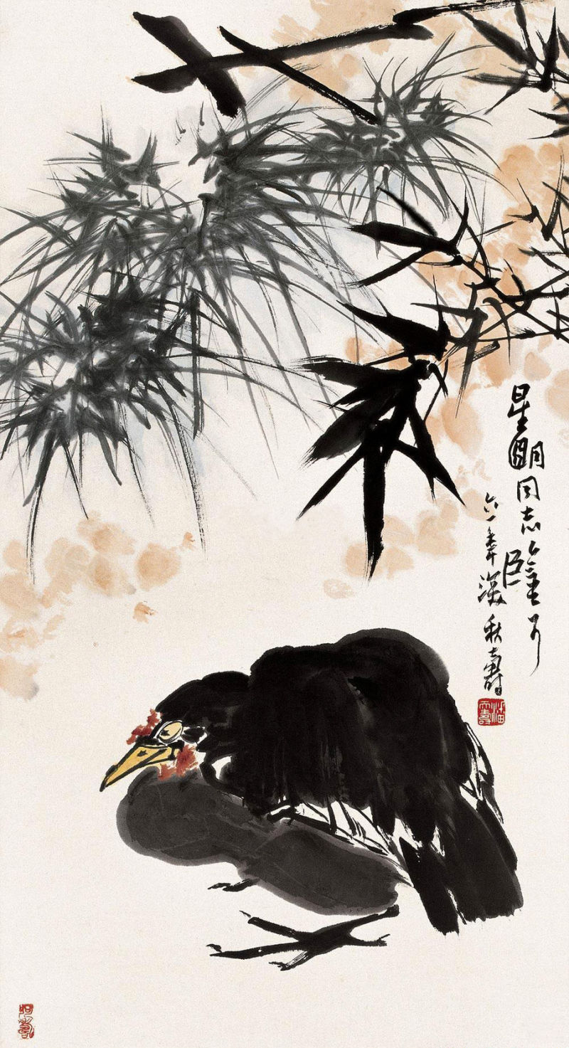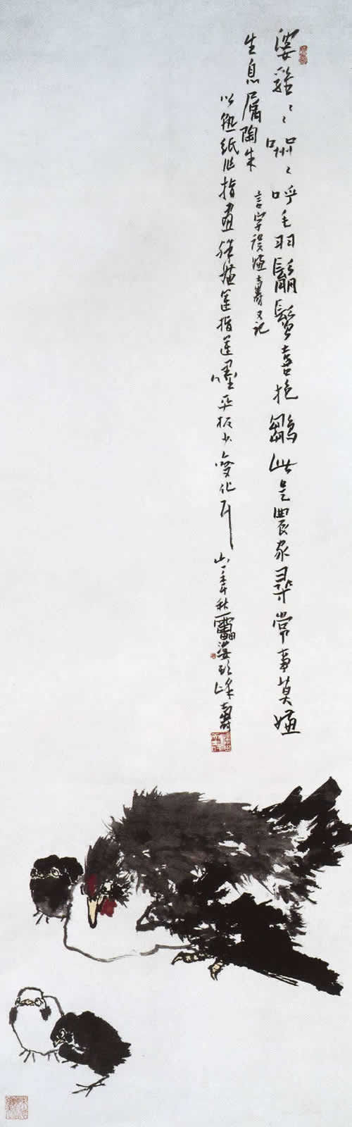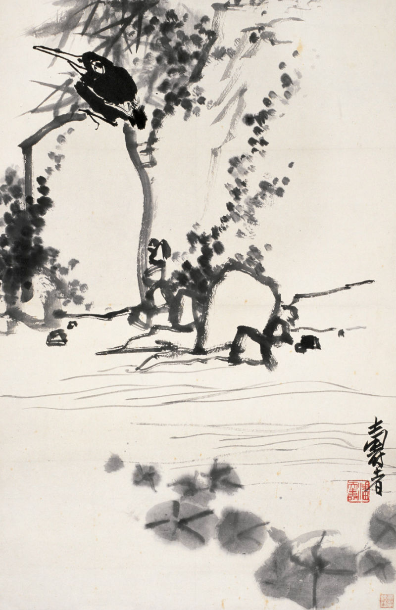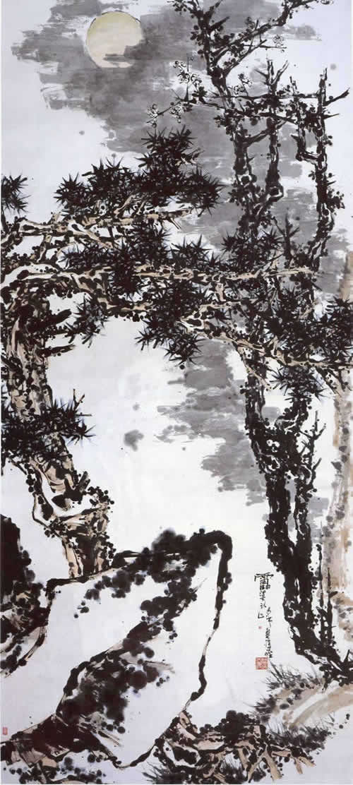潘天寿擅画写意花鸟和山水,远师徐渭、朱耷、原济(石涛)等人,近受吴昌硕影响;其画破常规、创新格,布局敢于造险、破险,笔墨浓重豪放,有金石味,色彩单纯,气势雄阔。书法从钟繇、颜真卿、史孝山人入手,后学秦汉、魏晋碑文,参以卜文猎碣。此幅小龙湫下一角图轴与潘天寿纪念馆藏品极为相似。