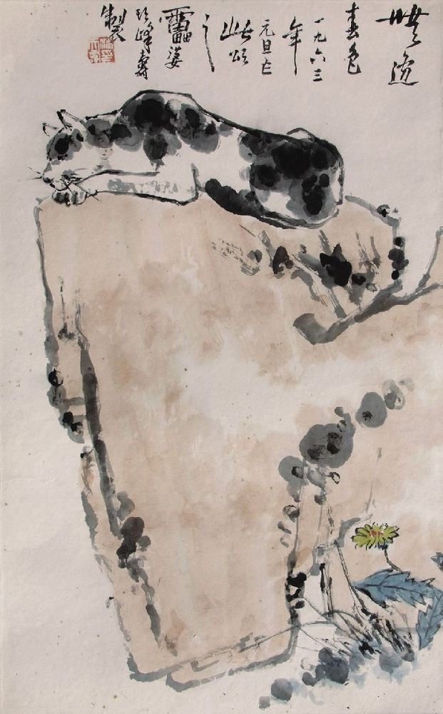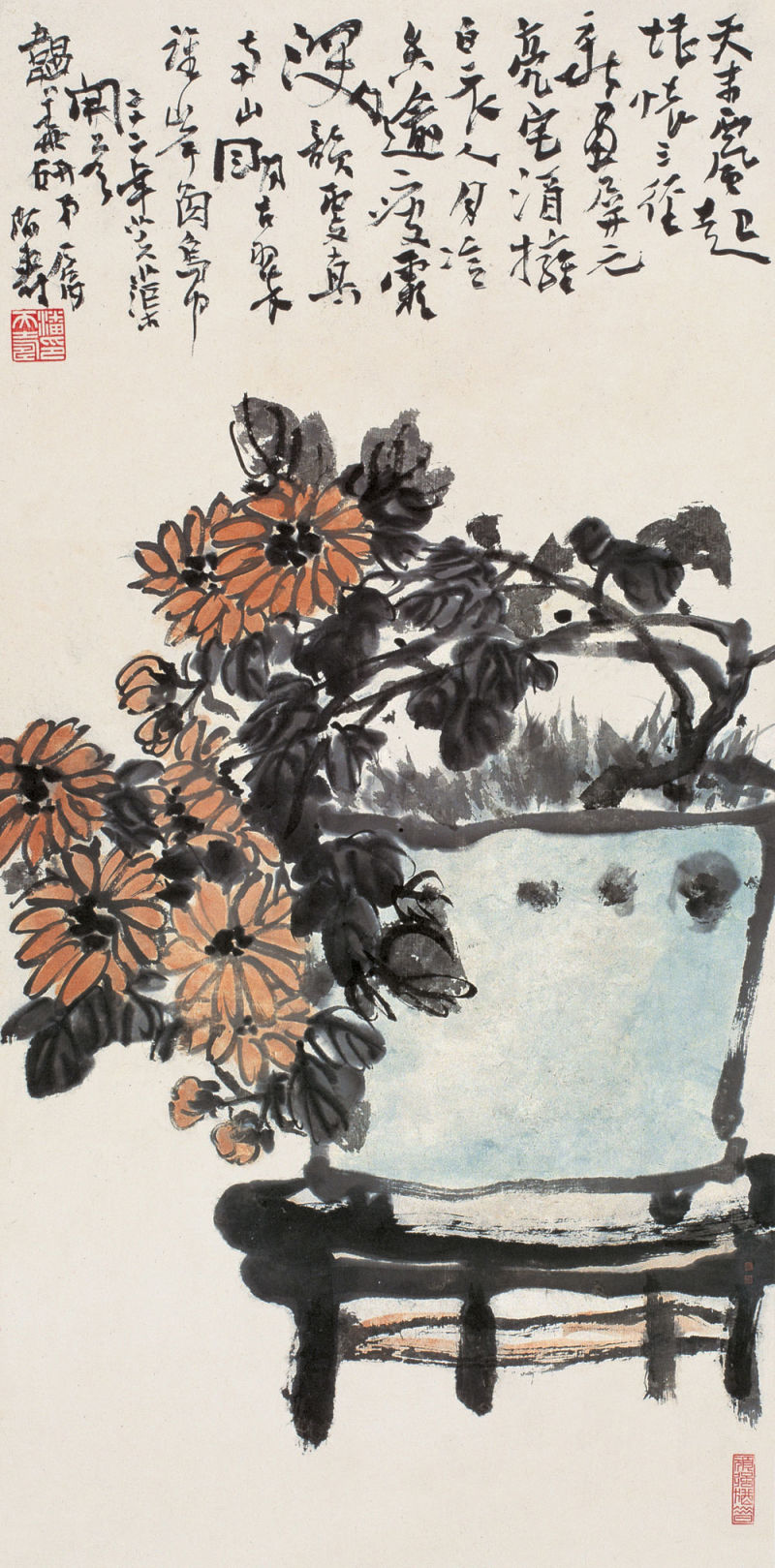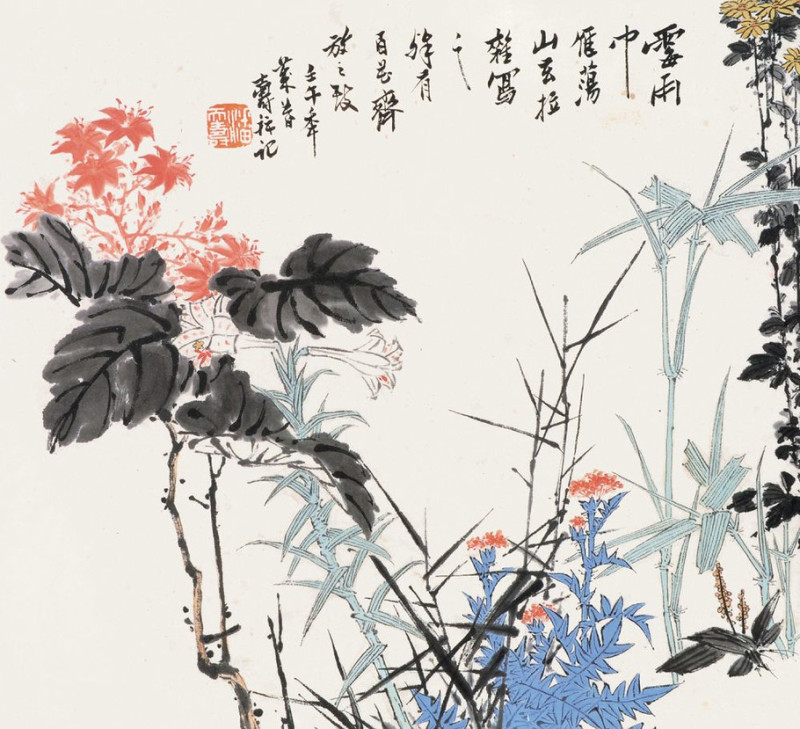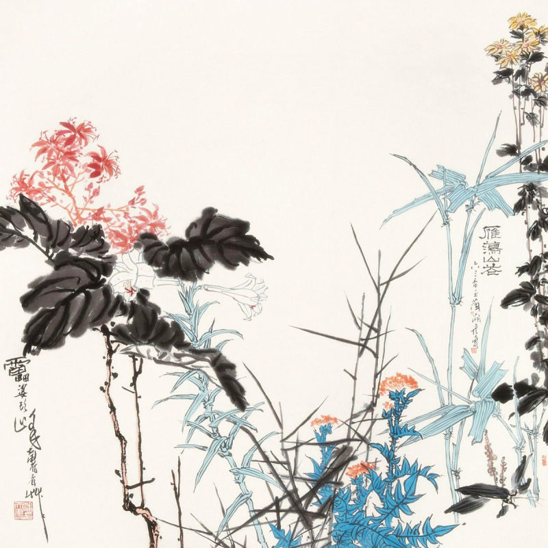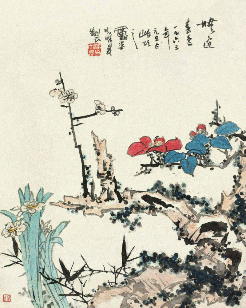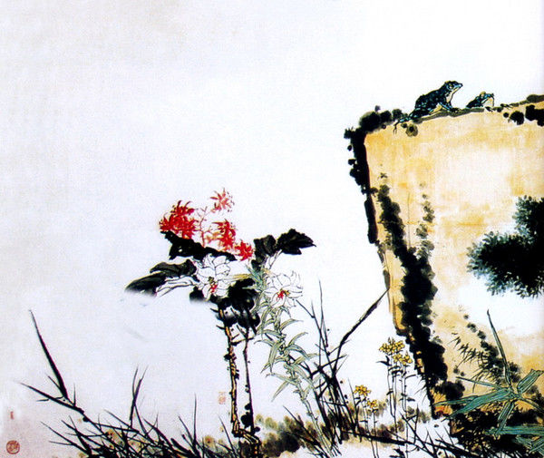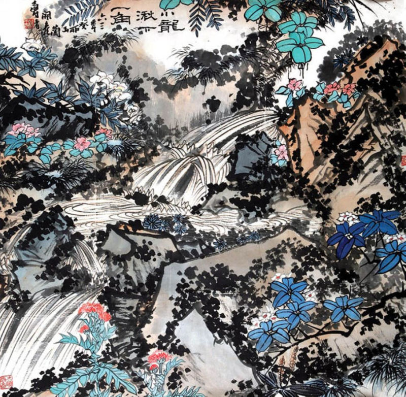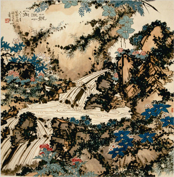 此作为潘天寿50年代中期到60年代初期融花卉于山水画的艺术实验中的代表作品。进行这一实验的目的,潘天寿自言希望“使山水画之布置,有异于古人旧样,亦合个人偏好。”在构图上,画家采用了近似于西方风景写生的焦点透视法,以相对封闭的结构方式,进行“四面包围”的造景。山石的写意与花卉的工笔各得其神,青绿与浅绛设色相得益彰,营造出石骨坚凝、花草青翠的自然景色。画面上不画飞瀑,只取溪水一角,既不落俗套,又得天真之趣,流水的灵动与岩石的坚硬对比鲜明,山水与花卉的结合开创出新的范式。