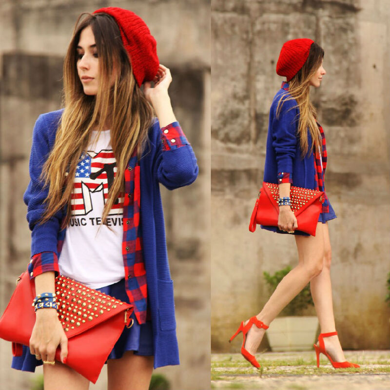 蓝色搭配红色,使人显得妩媚、俏丽,但应注意蓝红比例适当。