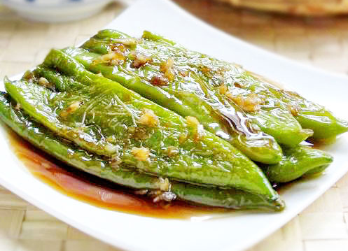 4、将青椒拨到锅头的一边,放入蒜末煸香,倒入步骤(2)的调料汁,翻炒入味,待汤汁收浓稠时即可盛入盘中
