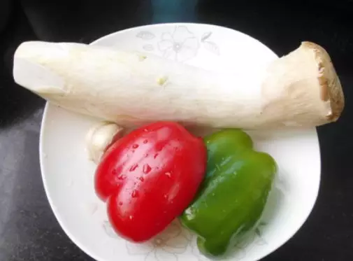 1. 杏鲍菇洗净,切片;肉和彩椒切片,加酱油1勺、淀粉1勺抓匀,腌10分钟;