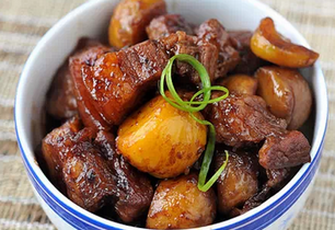 五花肉500克 板栗20克 姜适量 老抽2汤匙 料酒1汤匙 食盐少许 冰糖10克 小葱1根