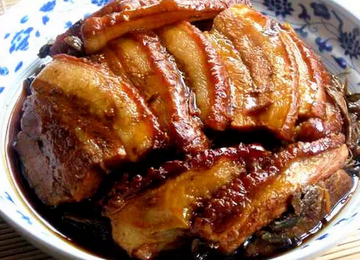 7、取出梅菜扣肉,在面上覆盖一个盘子,双手按住上下碗盘,迅速将盘子翻个面,梅菜扣肉就反扣在了盘中,再将多余的汤汁滗出来倒入锅中,用水淀粉勾芡,淋在扣肉上即可