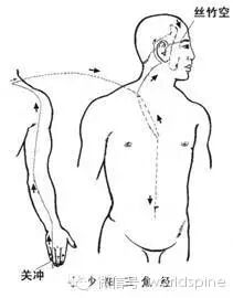 三焦经:心包经的精气传递给了三焦经后,从无名指的关冲穴出发,上行与上肢外侧中→肩后→侧颈→耳→眉梢、目外眦→与胆经汇合。