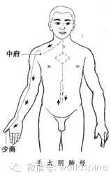 肺经:由胸走手,行走在上肢内侧前,止于大指的少商穴。